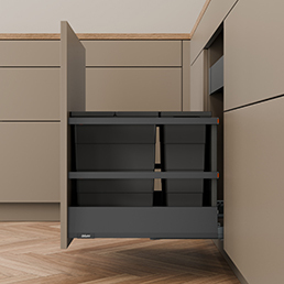 These waste bin systems fit directly into MERIVOBOX drawer boxes, with options for top-mounted bins in N height configurations and lower pull-out units using E height drawer sides or with additional gallery rails. Designed for efficient use of cabinet space, they support clean installation and a consistent finish across kitchen layouts.